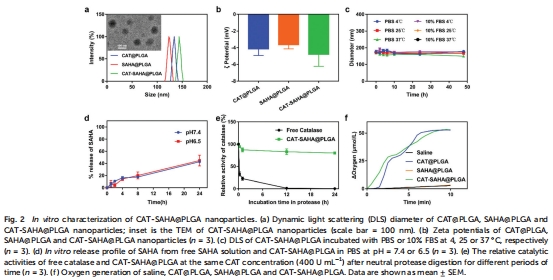 意義:PLGA外殼有效保護CAT活性,延長SAHA循環時間,解決裸酶易降解和HDAC抑制劑藥代動力學差的問題。