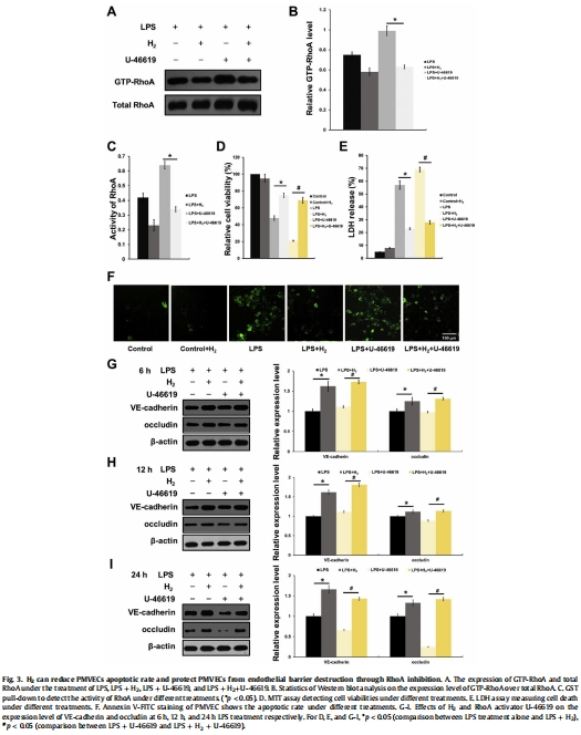 數(shù)據(jù):RhoA激活劑U-46619加劇LPS的損傷效應(凋亡率↑120%),而H?完全逆轉(zhuǎn)此效應(圖3D-F)。