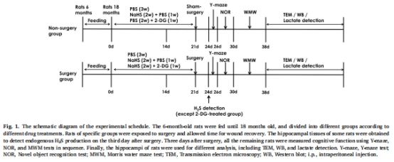 18月齡SD大鼠接受剖腹手術(模擬POCD),術后腹腔注射NaHS(30/100 μmol/kg)或聯合2-DG(糖酵解抑制劑)。
