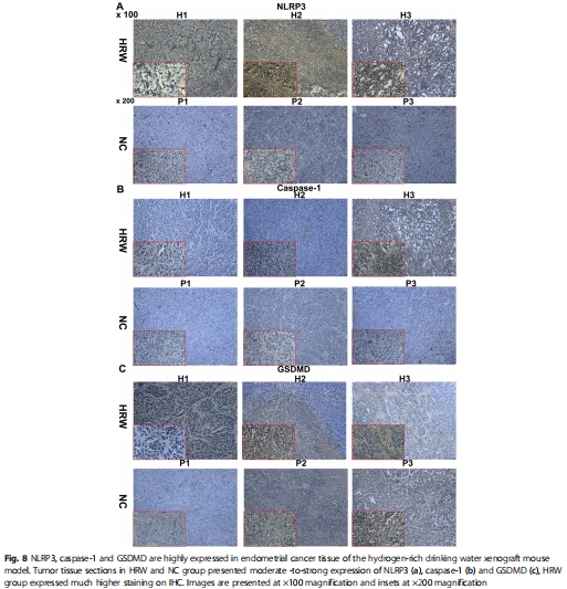 體內(nèi)效果:飲用富氫水(HRW)的小鼠腫瘤體積和重量顯著減小(圖7a-c),腫瘤組織NLRP3/caspase-1/GSDMD表達(dá)升高(圖8)。