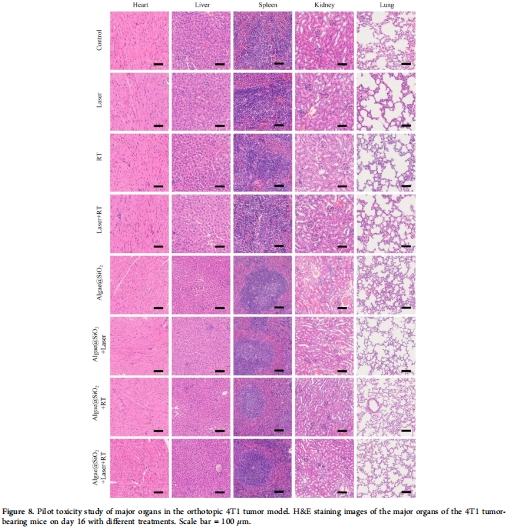 協同療效:在4T1乳腺癌模型中,Algae@SiO?聯合650 nm激光和X射線(6 Gy)顯著抑制腫瘤生長(90%以上)并減少肺轉移(圖5-7)。