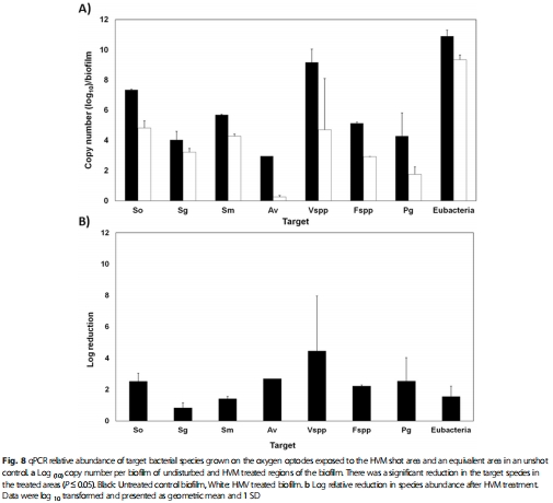 微生物影響:qPCR顯示厭氧病原體(如 P. gingivalis和 Fusobacterium spp.)減少1-4 log,總細(xì)菌量下降2 log(圖8)。