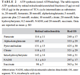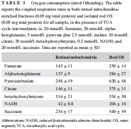氧消耗與ATP合成:測量OS盤和線粒體對7種底物(如琥珀酸、NADH)的呼吸活性(表1、表2)。