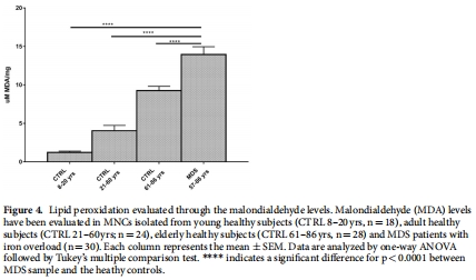 數(shù)據(jù):MDS的MDA水平(13.9±1 μM/mg)遠高于老年對照組(9.3±0.6),且與血清鐵蛋白正相關(r=0.8)。