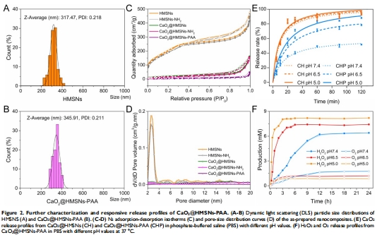 載體設(shè)計:中空介孔二氧化硅納米顆粒(HMSNs)負(fù)載過氧化鈣(CaO?),表面包覆聚丙烯酸(PAA)作為pH響應(yīng)門控。