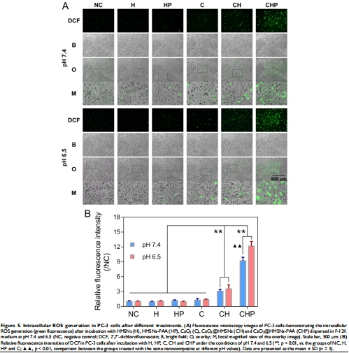 實(shí)驗設(shè)計:在模擬TME(pH 5.0-7.4)中量化CaO?@HMSNs-PAA的ROS釋放動力學(xué)(圖2F)。
