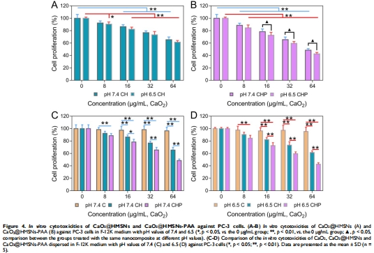 數(shù)據(jù):pH 6.5時,CaO?@HMSNs-PAA使PC-3細(xì)胞存活率降至42.6%(vs. pH 7.4時48.5%);游離CaO?無顯著毒性(存活率96.5%)。