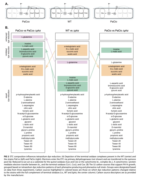 4 吩嗪還原機(jī)制依賴電子傳遞鏈組成和碳源身份,Cco末端氧化酶在吩嗪還原中起主要作用,但不同碳源下其他氧化酶也可能參與。