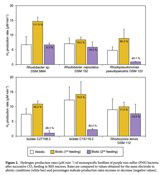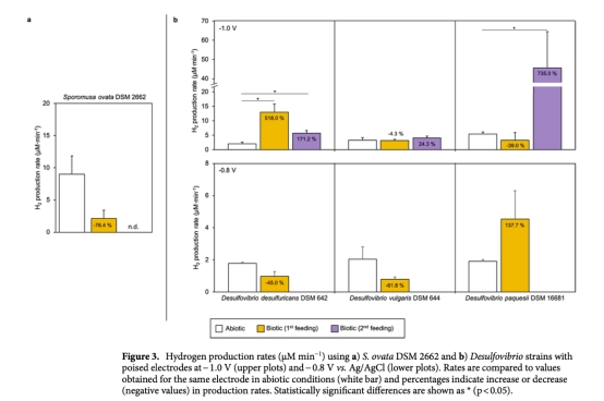 2 兩種Desulfovibrio菌株(D. desulfuricans DSM 642和D. paquesii DSM 16681)表現(xiàn)出持續(xù)且高效的產(chǎn)氫性能,尤其在長期操作中產(chǎn)氫速率顯著高于非生物條件。