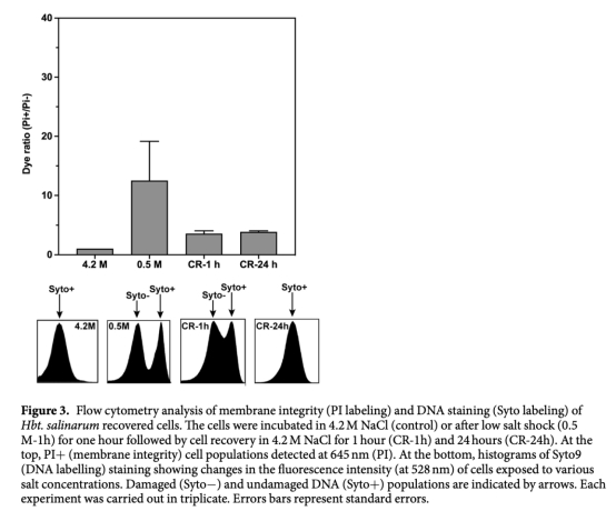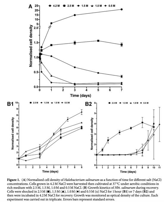1 Halobacterium salinarum中存在一個亞群體能夠耐受低鹽壓力(低至0.5 M NaCl)并在恢復至高鹽條件后復活。