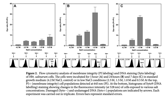 將Halobacterium salinarum置于不同低鹽條件(2.5 M至0.5 M NaCl)下處理不同時間(1小時、24小時、7天),然后轉移回生理鹽濃度(4.2 M NaCl)進行恢復;通過測量細胞生長、膜完整性(流式細胞術)、呼吸活性(氧消耗)、細胞形態(顯微鏡觀察)和蛋白質組分子動力學(中子散射),綜合分析其應激響應和恢復過程。