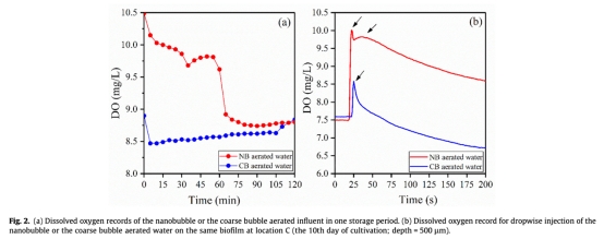 1 精準量化氧動態:實時記錄NB和CB曝氣下DO濃度變化(圖2a),顯示NB曝氣能使進水DO維持更高水平(>5.35 mg/L)且持續時間更長(80分鐘),直接證明NB的氧儲存和持續釋放能力。