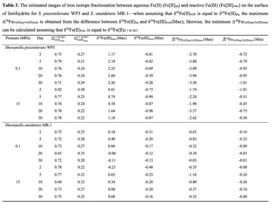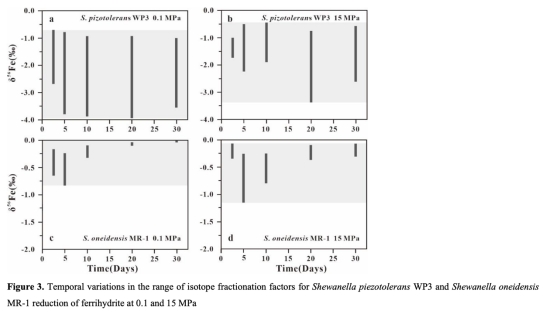 6. 估算的Δ56FeFe(II)aq-Fe(III)reac范圍隨時間變化的示意圖。該圖強調(diào)了S. piezotolerans WP3和S. oneidensis MR-1實驗估算出的分餾范圍存在顯著差異,且后者遠離-3‰的平衡值。數(shù)據(jù)來自圖3。