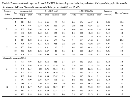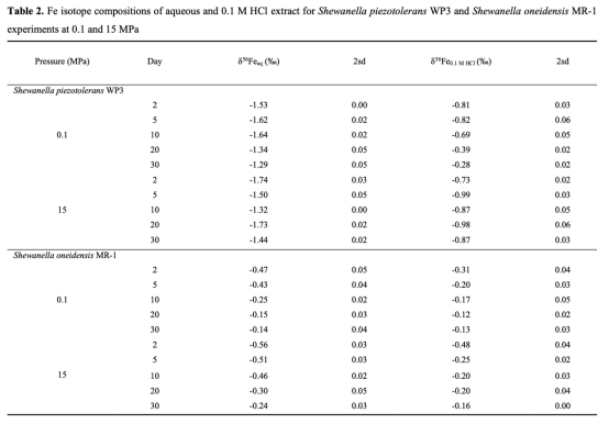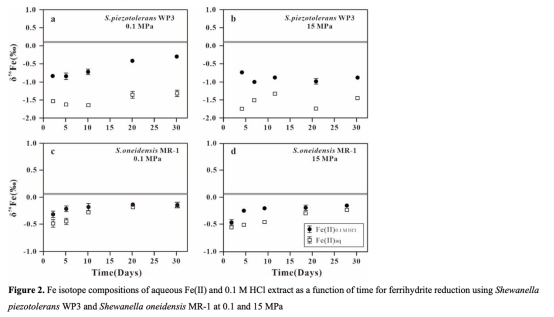 通過選擇高反應(yīng)活性的鐵礦物(水鐵礦)作為終端電子受體,并選用兩種不同的希瓦氏菌(S. piezotolerans WP3 和 S. oneidensis MR-1)在兩種不同壓力(0.1 MPa 和 15 MPa)下進行微生物還原實驗,以獲取差異顯著的還原程度。在不同時間點取樣,分離并測量不同鐵物相(水相Fe(II)、吸附態(tài)Fe(II)、剩余礦物等)的濃度和鐵同位素組成。利用同位素質(zhì)量平衡模型估算Fe(II)aq與Fe(III)reac之間的同位素分餾范圍,并結(jié)合吸附態(tài)Fe(II)的濃度變化,探討其與同位素分餾行為的關(guān)系,從而揭示分餾機制。