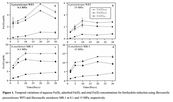 4. 總Fe(II)濃度隨時間變化的曲線。該圖直觀展示了兩種菌在不同壓力下的還原速率和最終還原程度的差異。數(shù)據(jù)來自圖1。