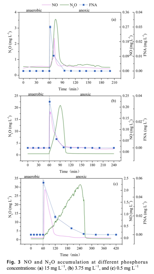 2. 低磷濃度(0.5 mg L?1)會導(dǎo)致顯著的一氧化氮(NO)和氧化亞氮(N2O)積累與排放。其排放因子遠(yuǎn)高于高磷濃度條件。