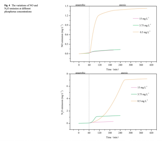 本研究探討了在亞硝酸鹽反硝化除磷(N-DPR)過程中,磷濃度對污染物去除以及一氧化氮(NO)和氧化亞氮(N2O)產(chǎn)生的影響。N-DPR是NO和N2O產(chǎn)生的重要來源,其對環(huán)境有強(qiáng)烈的負(fù)面影響。結(jié)果表明,磷去除效率隨著磷濃度的增加而提高,這是由于在高磷濃度下反硝化聚磷菌(DPAOs)的富集所致。在磷濃度為0.5 mg L?1時觀察到高的NO產(chǎn)量,這主要歸因于還原酶活性恢復(fù)緩慢和DPAOs豐度較低。最大的N2O積累量(31.45 mg L?1)也在磷濃度為0.5 mg L?1時達(dá)到。可能的原因是低磷濃度下糖原積累菌(GAOs)合成的聚羥基烷酸鹽(PHAs)較少,這會加劇不同還原酶之間的電子競爭。此外,游離亞硝酸(FNA)的抑制是N2O高產(chǎn)量的另一個重要原因。