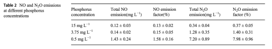 3. NO和N?O排放總量與排放因子(來自圖4和表2):計算了不同磷濃度下NO和N?O的累積產(chǎn)生量及其占去除氮量的比例。該數(shù)據(jù)量化了磷濃度對溫室氣體和有害氣體排放的顯著影響,表明低磷濃度(0.5 mg L?1)下的排放因子是髙磷濃度(15 mg L?1)下的數(shù)十倍。