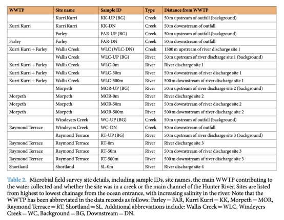 1. 研究區(qū)域與采樣設(shè)計(jì):選擇澳大利亞新南威爾士州的Hunter河口作為研究區(qū)域,該河口接收來自多個(gè)污水處理廠(WWTP)的經(jīng)三級(jí)處理后的廢水。在河口的上下游設(shè)置了20個(gè)采樣點(diǎn)(見表2),于2016年11月和2017年2月( Austral夏季)進(jìn)行了兩次大規(guī)模野外調(diào)查采樣。