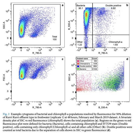 3. 流式細(xì)胞術(shù)數(shù)據(jù)(圖2為例圖):提供了總細(xì)菌和藻類細(xì)胞的絕對(duì)數(shù)量以及細(xì)胞大小信息。該數(shù)據(jù)直接反映了微生物的生物量和生長(zhǎng)狀況,是評(píng)估廢水促進(jìn)或抑制微生物生長(zhǎng)的最直觀指標(biāo)。