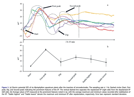 電極插入在狐尾藻(Myriophyllum aquaticum)植物中產生緩慢傳播的電位