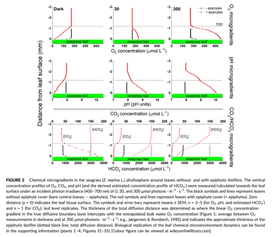 摘要闡述了沿海富營養化導致海草(Zostera marina L.)葉片附生生物膜過度生長的問題。本研究使用電化學微傳感器測量了有無附生生物膜覆蓋的海草葉片表面的O2、pH和CO2微梯度,以確定附生生物膜對葉片化學微環境的影響。結果表明,附生生物膜導致葉片表面pH、O2和無機碳濃度出現極端的晝夜波動,嚴重阻礙了植物的性能。在光照下,葉片附生生物膜及其擴散邊界層導致強烈的堿化,顯著降低了葉片表面的CO2和HCO3-可用性,從而導致碳限制和光呼吸增強,降低了光合效率。有附生生物膜時,葉片表面pH升高至>10,超過了主動光合作用的最終pH水平(~9.62)和CO2補償點。在黑暗中,附生生物膜導致葉片表面CO2增加和缺氧。由于強烈的葉圈堿化導致CO2耗盡以及代價高昂且有限的HCO3-利用,附生生物膜可導致海草嚴重的碳限制,增加了植物饑餓的風險。