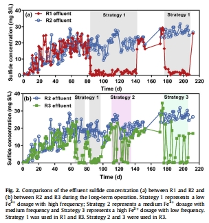 機(jī)制差異:控制機(jī)制因策略而異。低劑量、高頻率策略主要通過化學(xué)作用(Fe3?與H?S反應(yīng)生成FeS和單質(zhì)S)在污水水體中去除硫化物,不抑制微生物活性。高劑量、低頻率策略則主要通過生物抑制作用,抑制表層沉積物中SRB和MA的活性,同時(shí)伴隨化學(xué)作用。