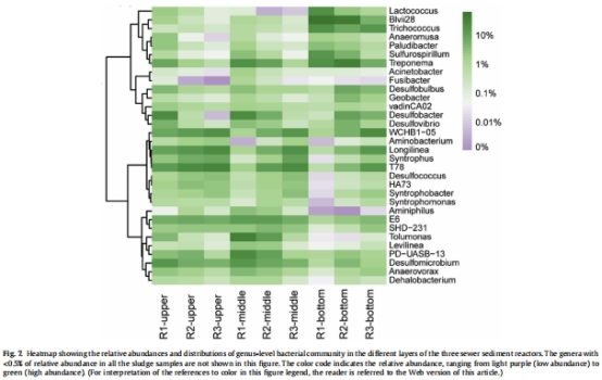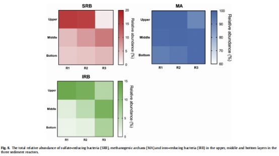 來源:屬水平細(xì)菌群落(包括SRB)的熱圖見圖7;SRB、MA和鐵還原菌(IRB)在各層總相對豐度見圖8。