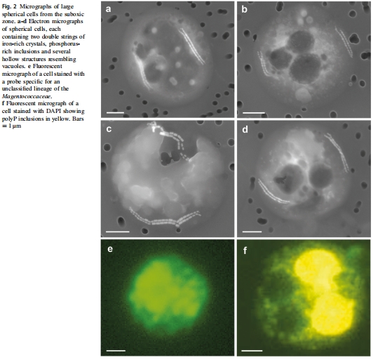 意義:SEM和熒光顯微鏡顯示直徑4.6-6.8 μm的球形細胞含磁小體鏈和polyP內含物(DAPI染色),CARD-FISH鑒定為 Magnetococcaceae相關菌。