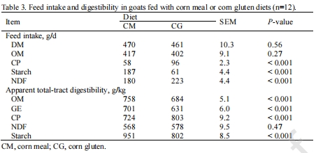 數據:CG組顯著提高了NDF和CP攝入量(P < 0.001),但降低了淀粉攝入量;CG組有機物質(OM)和總能(GE)消化率降低(P < 0.001),而CP消化率提高(P < 0.001)。