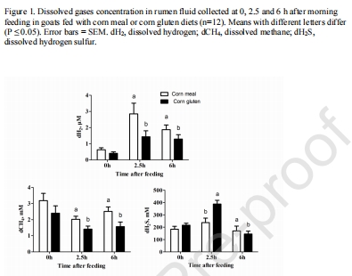 數據:Figure 1通過曲線圖展示了dH2、dCH4和dH2S在晨飼后0、2.5和6小時的變化趨勢,CG組dH2S在2.5小時峰值顯著高于CM組。