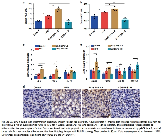 表型確認(rèn):首先在高脂飲食喂養(yǎng)的斑馬魚(成年和幼魚)模型中,確認(rèn)LGG EPS和BL23 EPS在減輕肝臟脂肪變性和誘導(dǎo)肝臟損傷上的不同表型。