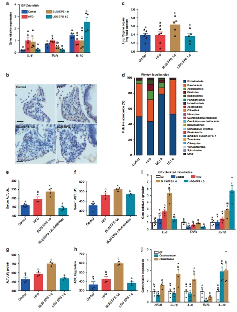微生物組作用:通過無菌斑馬魚實驗、抗生素清除菌群實驗和菌群移植實驗,證明BL23 EPS的肝損傷效應(yīng)依賴于其誘導(dǎo)的腸道菌群失調(diào),而非多糖本身直接毒性。
