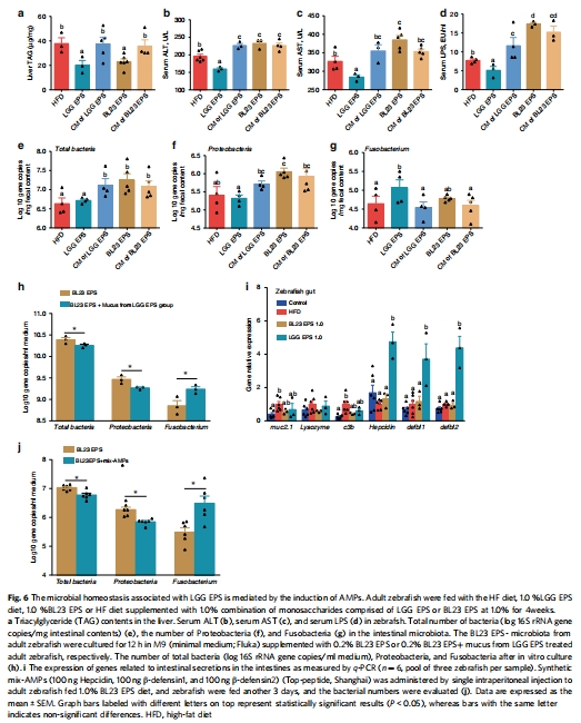 本研究深入探究了不同來源的細(xì)菌胞外多糖(EPS) 在改善高脂飲食誘導(dǎo)的斑馬魚肝臟脂肪變性(hepatic steatosis)時,所表現(xiàn)出的截然不同的安全性。盡管來自鼠李糖乳桿菌GG(LGG EPS) 和干酪乳桿菌BL23(BL23 EPS) 的多糖都能有效減少肝臟脂肪堆積,但只有BL23 EPS會引發(fā)肝臟炎癥和損傷。機制研究表明,這種差異源于兩者對腸道菌群的不同調(diào)控:BL23 EPS導(dǎo)致菌群失調(diào)(dysbiosis),而LGG EPS促進菌群穩(wěn)態(tài)(homeostasis)。核心發(fā)現(xiàn)是,LGG EPS能直接激活腸道上皮細(xì)胞中的缺氧誘導(dǎo)因子HIF1α,進而上調(diào)抗菌肽(AMPs)的表達,后者是維持腸道微生物平衡的關(guān)鍵效應(yīng)分子。而BL23 EPS缺乏此功能。最終,研究指出,一種益生元多糖是否存在肝臟損傷風(fēng)險,取決于其激活HIF1α-抗菌肽軸的效率,這一結(jié)論也適用于其他多種常見天然多糖。
