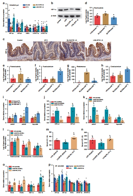 因果驗證:使用HIF1α抑制劑(YC-1) 處理LGG EPS組,以及利用HIF1α活性先天增強的突變斑馬魚(foxo3b-/-) 處理BL23 EPS組,反向驗證HIF1α-抗菌肽軸是決定菌群穩(wěn)態(tài)和肝臟安全性的關(guān)鍵樞紐。