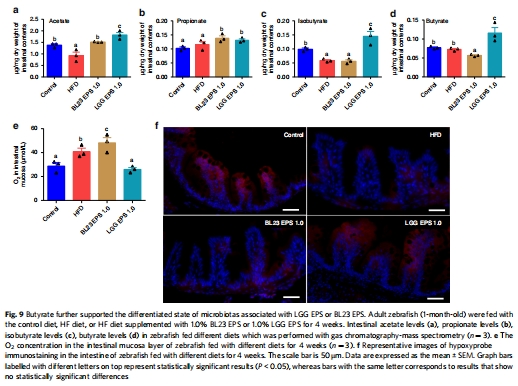提供了連接“菌群功能”與“宿主生理”的關(guān)鍵橋梁數(shù)據(jù):本研究提出了一個重要的假設(shè):LGG EPS組菌群產(chǎn)生更多丁酸鹽,而丁酸鹽能降低腸道氧分壓,從而穩(wěn)定HIF1α并創(chuàng)造不利于有害菌生長的環(huán)境。Unisense電極的原位、實時、高空間分辨率測量,直接證實了LGG EPS組斑馬魚腸道內(nèi)的氧氣濃度顯著低于BL23 EPS組和HFD組。這組定量數(shù)據(jù)為整個“丁酸鹽→低氧→HIF1α穩(wěn)定→菌群穩(wěn)態(tài)”的假設(shè)鏈條提供了最堅實的實證支持,使其從推測變?yōu)榭尚诺慕Y(jié)論。