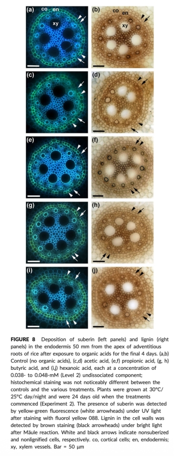 摘要指出,水淹土壤中含有厭氧微生物產生的單羧酸(有機酸),這些酸可積累到植物毒性水平,并促進濕地物種根系徑向氧損失(ROL)屏障的發展。本研究測試了低濃度有機酸(乙酸、丙酸、丁酸、己酸)可能誘導水稻根系ROL屏障形成的假設。結果發現,每種有機酸單獨均能觸發ROL屏障,但對根系伸長影響很小或沒有影響。一些與木栓質生物合成相關的基因轉錄本增加。根系呼吸沒有或僅中度抑制,但超過一定濃度后呼吸呈指數下降。EC50(抑制50%呼吸的有效濃度)順序為丁酸、丙酸、乙酸、己酸。研究揭示了有機酸作為環境信號觸發根系適應性反應的機制,有助于理解植物淹水耐受的分子調控。