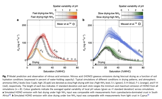 摘要指出,土壤中的微觀尺度相互作用可能導(dǎo)致高度局部化的條件,從而不成比例地影響氮轉(zhuǎn)化過(guò)程。研究通過(guò)機(jī)制模型模擬了土壤表面和生物結(jié)皮干燥過(guò)程中耦合的生物和非生物過(guò)程,表明局部微生物活動(dòng)與薄水膜內(nèi)的pH變化共同增強(qiáng)了土壤干燥過(guò)程中亞硝酸(HONO)和氨(NH3)的排放,遠(yuǎn)高于基于平均水分條件和整體土壤pH的預(yù)測(cè)值。模型預(yù)測(cè)與干燥生物結(jié)皮的反應(yīng)性氮?dú)怏w通量測(cè)量案例一致,顯示土壤和生物結(jié)皮干燥速率影響HONO和NH3排放動(dòng)態(tài),且大氣NH3水平對(duì)反應(yīng)性氮?dú)怏w損失有強(qiáng)烈影響。實(shí)驗(yàn)室測(cè)量證實(shí)了微觀pH局部化的發(fā)生,強(qiáng)調(diào)了微環(huán)境在陸地生態(tài)系統(tǒng)生物地球化學(xué)通量中的關(guān)鍵作用。