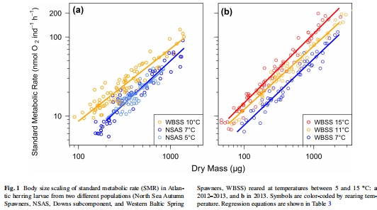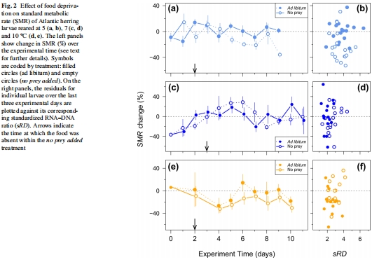 在充分喂養的幼蟲中,SMR與短期(耳石邊緣增量寬度)或長期(體型大小、耳石直徑)生長指標無關,但與耳石核心直徑(孵化至首次攝食期間形成)呈負相關。
