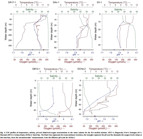 站點選擇:在2013年11月,沿從斯卡格拉克(D17-1站,328m)到波羅的海南部漢灣(DCHa-2站,71m)的斷面,選擇了五個站點(圖1),涵蓋了巨大的鹽度(35.2 到 14.1)、pH和氧濃度梯度。
