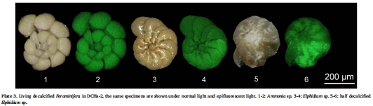 研究意義:這些數(shù)據(jù)直接展示了生物對環(huán)境梯度的響應。密度和豐富度從斯卡格拉克(最高)向波羅的海(最低)遞減。每個站點都有其標志性物種,反映了不同的環(huán)境適應策略(如斯卡格拉克的C. laevigata和 H. balthica,卡特加特和厄勒海峽的N. aff. stella和 S. fusiformis)。最關鍵的發(fā)現(xiàn)是,在波羅的海站點,優(yōu)勢種Ammoniaspp. 和 Elphidiumspp. 的鈣質殼出現(xiàn)部分至完全溶解,僅剩下有機內襯,但其CTG標記顯示它們仍然是活體(Plate 3)。這證明了在多重壓力下,有孔蟲可能犧牲鈣質殼以維持生命活動。