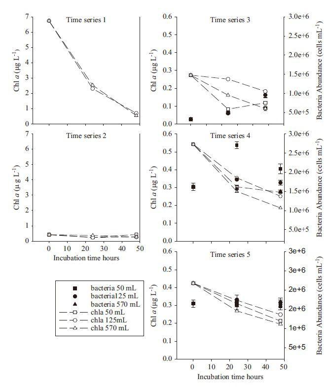 圖2.不同時(shí)間序列實(shí)驗(yàn)中的葉綠素a濃度和細(xì)菌豐度。