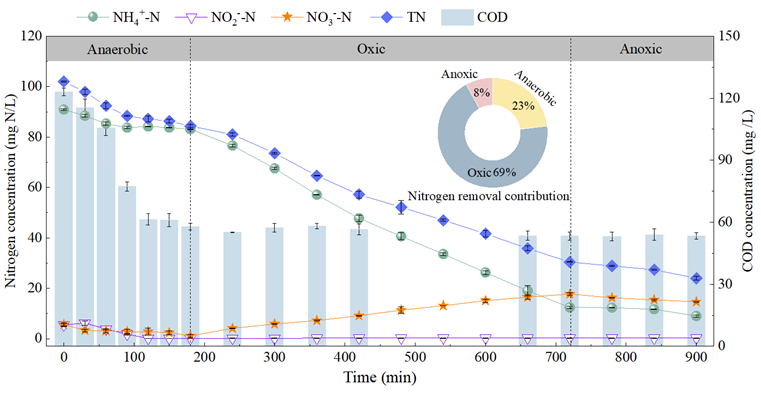 圖5第115天典型周期內(nèi)COD和氮濃度的變化