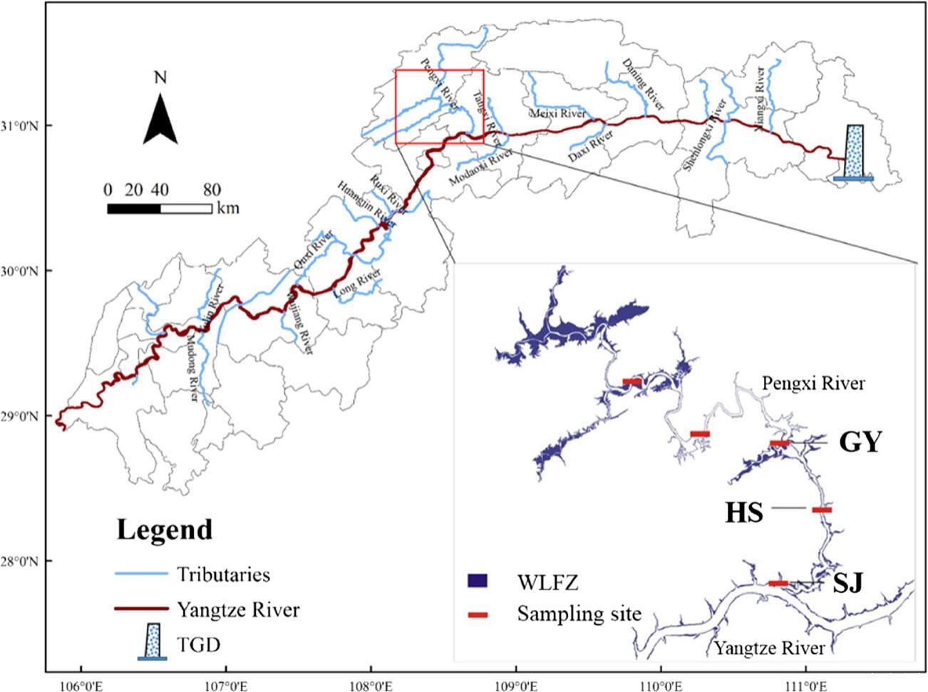 圖1、三峽大壩區域及本實驗中詳細研究地點的地圖。