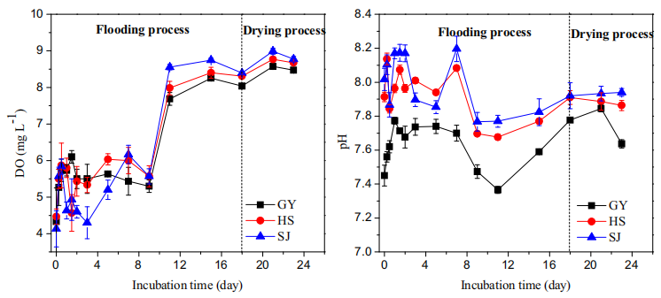 圖2、洪水-干燥過程中上層水DO濃度和pH的變化。