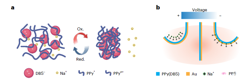 通過在0.1 M NaDBS/0.1 M吡咯溶液中施加2 mA cm-2的恒定電流,研究者們以電化學方式將PPy(DBS)沉積在Au涂覆的聚對二甲苯C(PaC)薄膜上。在薄膜沉積過程中,帶負電的大體積陰離子DBS-被納入聚合物基質中,以保持整體電荷中性。