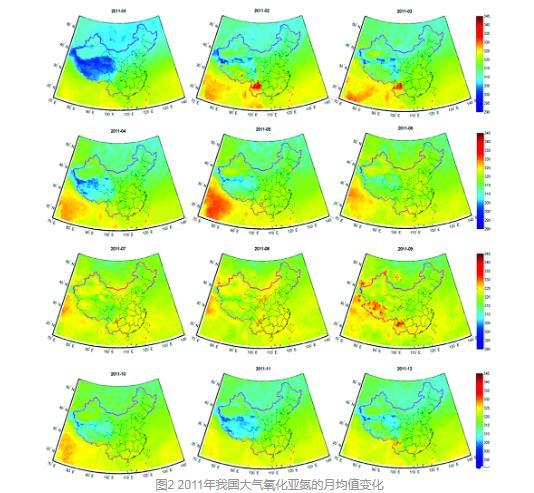 在利用驗證結(jié)果完善反演算法的基礎(chǔ)上,開展了我國氧化亞氮濃度的時空變化反演分析。如圖2所示為2011年我國氧化亞氮濃度的月均值分布圖,時空分布顯示,我國氧化亞氮濃度月度間變化比較明顯,從1月份開始,氧化亞氮濃度逐月遞增,8月份最高,之后逐月遞減。