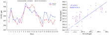驗證結(jié)果如圖1所示,衛(wèi)星遙感與地面觀測結(jié)果一致性較好,相關(guān)系數(shù)r為0.73,驗證樣本數(shù)為7月—9月內(nèi)的23個有效值。