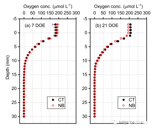 在每種情況下,兩種水類型的土壤氧協(xié)調作用都從0到1 mm深度急劇下降(圖3)。在7和21 DOE處達到20毫米深度,在35和49 DOE處達到25毫米深度之前,氧濃度降低到檢測極限以下(即0.3μmolL-1)。氧氣耗竭的程度隨時間而降低。另外,地表水中的氧氣濃度(即,<0mm深度)隨時間逐漸增加。在7和21 DOE上未觀察到水類型對氧氣濃度的影響;然而,最終在35 DOE上觀察到了這種影響,這種趨勢一直持續(xù)到49 DOE。在35 DOE上,在5–7和12–13 mm深度處觀察到水類型之間的氧濃度存在顯著差異,在4、8–11和14–15 mm深度處觀察到邊際差異(p<0.1)。