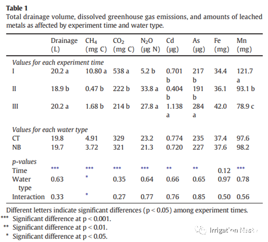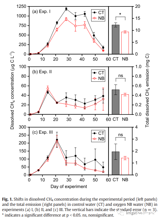 總CH4排放量受實驗時間和水類型的影響很大,并且存在顯著的相互作用(表1)。在每種類型水中,實驗時間的影響也很明顯。這種相互作用歸因于水類型不同對實驗時間的不同響應。也就是說,僅在最大排放量的實驗I中觀察到由于使用含氧納米氣泡水而導致的CH4排放顯著下降(降低了24%),而在實驗II中觀察到了這種趨勢(降低了20%)。III(減少28%),排放量較小(圖1)。